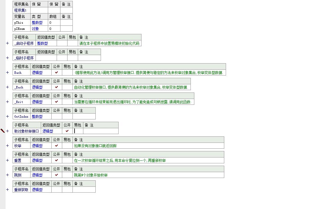 系统结构:Each,Exit,GetIndex,取对象枚举接口,枚举,重置,跳到,重新获取,Next,Skip,Reset,MultiByteToWideChar,动态调用子程序_API,WMI取系统信息,取标题,枚举对象集合,Each_Object,Each,GetIndex,取对象枚举接口,枚举,重置,跳到,重新获取,Next,Skip,Reset,MultiByteToWideChar,动态调用子程序_API,