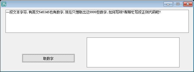 功能说明:该程序是一个基于易语言编写的正则表达式工具,主要功能是通过正则表达式从输入文本中提取数字并显示在另一个编辑框中。程序的核心逻辑是使用正则表达式“\d+”来匹配所有连续的数字,并将这些数字逐行输出到第二个编辑框中。标题表明该程序的主要用途是提取数字文本,其功能与正则表达式的使用密切相关。