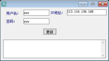 这是一个典型的单窗口桌面应用程序,界面包含用于输入用户名、密码的编辑框,显示当前获取到的公网 IP 地址的编辑框,显示请求日志的文本域以及状态标签和触发按钮。程序集成了基础的互联网通信能力,通过调用系统组件实现 HTTP 请求,并内置了加密算法处理身份验证。