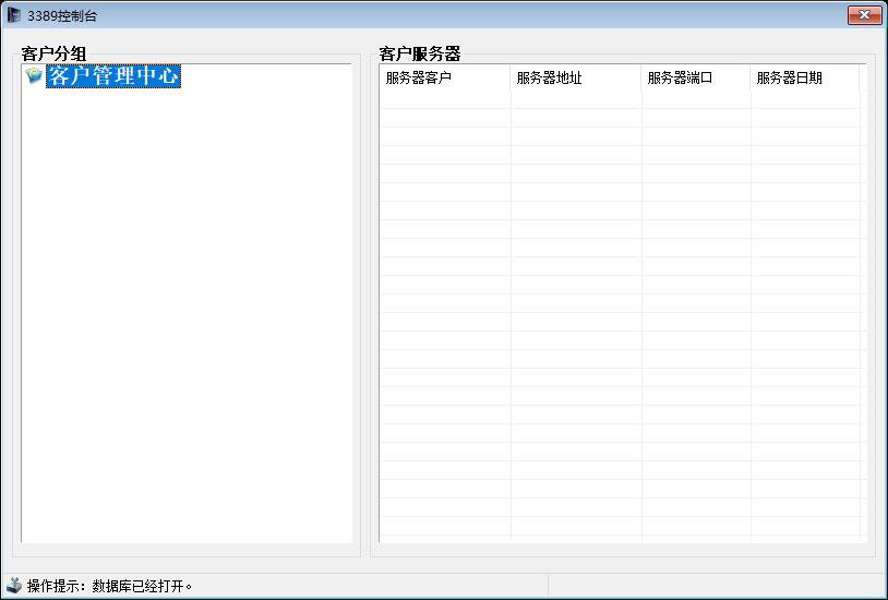 程序入口位于`.子程序 __启动窗口_创建完毕`。启动时,系统首先检查并打开两个核心数据库文件:`customers.edb`(存储客户分组信息)和 `data.edb`(存储具体的服务器连接数据)。同时,程序会读取根目录下的`!setup.ini` 配置文件来加载自定义界面皮肤,并通过底部状态条向用户反馈“数据库已经打开”的系统就绪状态。