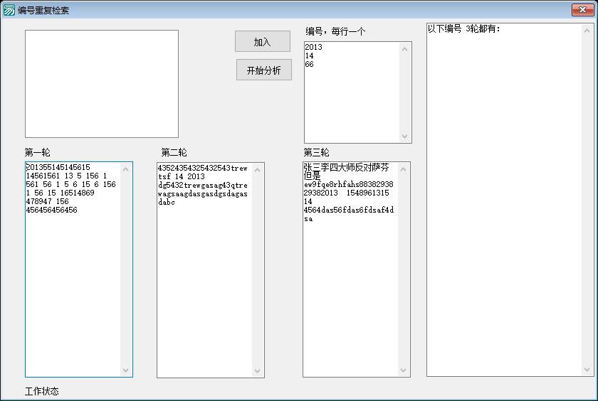- 如果三个关键词全部存在,状态显示为"1/2/3 号全有”,并将该结果添加到结果输出框(`ok1`)中。