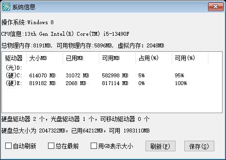 功能说明:该程序是一个基于易语言开发的本地系统硬件信息检测与磁盘空间监控工具,主要面向Windows平台,具备操作系统识别、CPU型号读取、内存状态统计及全盘驱动器空间分析等核心功能。程序启动后自动初始化一个六列列表框(m_driverlist),用于结构化展示各驱动器的类型、容量、已用/可用空间及占用率百分比;同时通过多个独立子程序协同工作:GetOsVersion子程序调用Windows API GetVersion()解析系统版本号,并依据主次版本号映射显示“Windows 2000”至“Windows 8”等具体操作系统名称,输出至IIDC_OSVERSION控件;GetCpuInfo子程序从注册表路径“HARDWARE\DESCRIPTION\System\CentralProcessor\0\ProcessorNameString”读取CPU品牌与型号字符串,格式化为“CPU信息:xxx”显示于IDC_CPUINFO控件;GetMemInfo子程序调用GlobalMemoryStatus()获取全局内存状态,计算并显示总物理内存、可用物理内存及虚拟内存大小(单位MB),精度经四舍五入处理,结果呈现于IDC_MEMINFO控件;核心功能GetDriverInfo子程序遍历A:至Z:共26个盘符,利用GetDriveType()识别驱动器类型(固定硬盘、光驱、移动设备等),筛选出有效驱动器后,再通过GetDiskFreeSpaceEx()精确获取各驱动器的总空间、剩余空间(支持64位大容量),并根据界面选项“选择框_大小.选中”状态动态切换显示单位为GB或MB——若勾选则以GB为单位显示容量、已用、可用值,并在驱动器名称前添加“(硬)/(光)/(移)”标识;同时自动计算并填充“占用(%)”和“可用(%)”两列,实现对磁盘使用健康度的直观量化评估。整个程序无外部依赖,纯本地运行,不联网、不写入、不修改系统,仅作信息采集与可视化展示,适用于IT运维人员快速诊断系统基础环境、普通用户了解本机硬件配置及存储状况,属于轻量级系统信息查看器(System Information Viewer)范畴。