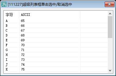 程序启动时(__启动窗口_创建完毕子程序),首先在超级列表框中动态插入26个表项(对应ASCII码#A键至#Z键,即字母A–Z),每项标题显示其对应字符的ASCII数值(如第0项为“A”,标题显示“65”)。随后,程序调用API_SetWindowLong将主窗口的消息处理函数(“处理”子程序)设为自定义窗口过程,实现对WM_NOTIFY消息的全局拦截。