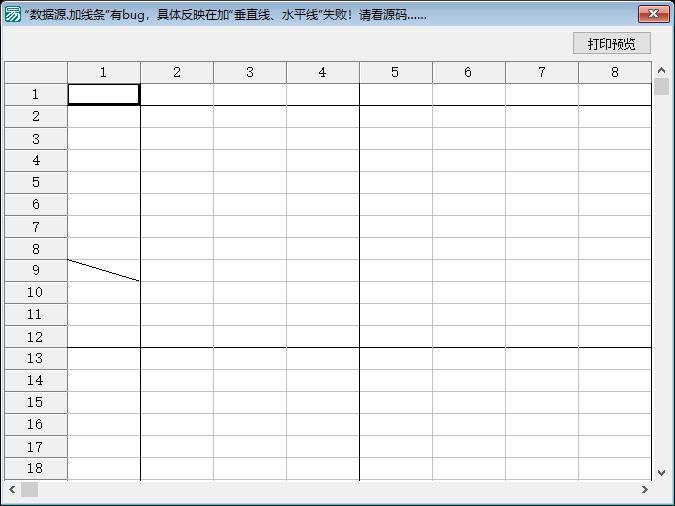 功能说明:该程序是一个基于易语言开发的轻量级表格打印预览工具,核心功能是创建一个具有固定行列结构(38行×8列)、预设列宽(193像素)和规范边框样式的表格,并支持一键触发打印预览。程序启动后自动载入主窗口(窗口1),在窗口创建完毕时完成表格控件(“数据源”)的初始化配置:指定数据提供者为“通用提供者”,设置初始行列数,并通过多次调用“数据源.加线条”方法,在关键区域(如表头、表尾、左右分隔、上下分界等)添加实线边框(#左边框、#上边框、#右边框、#下边框),确保打印预览中可见且布局清晰;同时代码中明确注释指出“#垂直线”和“#水平线”类型线条存在渲染缺陷——在打印预览中无法显示,属于已知显示bug,故实际使用中仅依赖四边框组合实现表格分区与视觉引导。用户点击“按钮1”即可调用“表格.打印预览()”方法,直接进入所见即所得的打印预览界面,无需生成物理文档或连接打印机,适用于日常办公中快速校验表格格式、列宽、边框完整性及整体排版效果。程序结构简洁,无数据录入、计算、保存或导出逻辑,不涉及数据库操作或外部文件读写,纯属前端表格样式配置与预览展示,定位为辅助性格式校验工具。