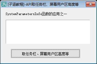 功能说明:该程序的主要功能是通过点击按钮来获取并显示当前计算机屏幕的用户区(即除去任务栏后的可用区域)尺寸以及任务栏的高度。具体实现上,程序使用了Windows API函数`SystemParametersInfoA`来获取屏幕用户区的矩形信息。然后,它计算出任务栏的高度,并将这些信息以文本形式展示在编辑框1中。此外,程序还附加了一些额外的文字说明,如解释为什么任务栏宽度与用户区宽度相同等细节。此程序适合需要了解或调试窗口布局、屏幕分辨率及其相关参数的应用场景。