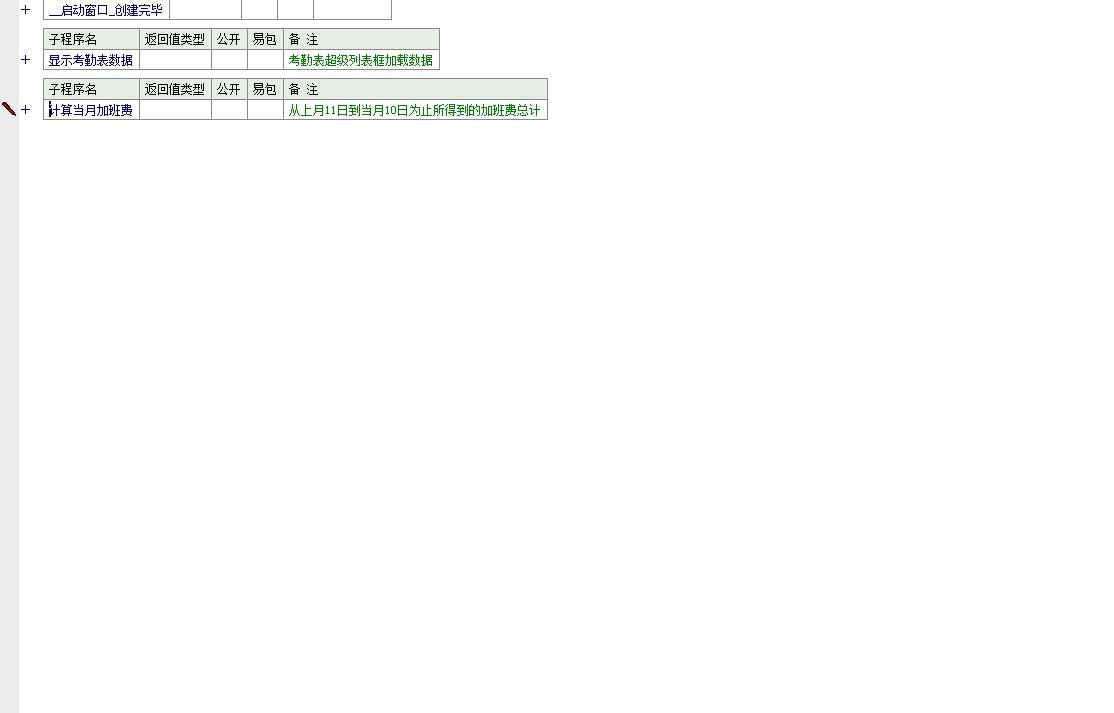 功能说明:该程序主要功能是连接本地的Access数据库(dbs.mdb),并从中读取特定日期范围内的考勤记录,包括员工ID、日期、上班时间、下班时间、加班时长以及加班费等信息,并将这些数据加载到一个超级列表框中展示。此外,程序还具备根据加载的数据计算当月(从上月11日至本月10日)总加班费的功能。具体来说:
