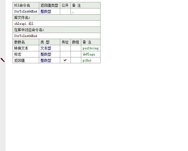 .DLL命令 StrToInt64ExA, 整数型, "shlwapi.dll", "StrToInt64ExA", , ,