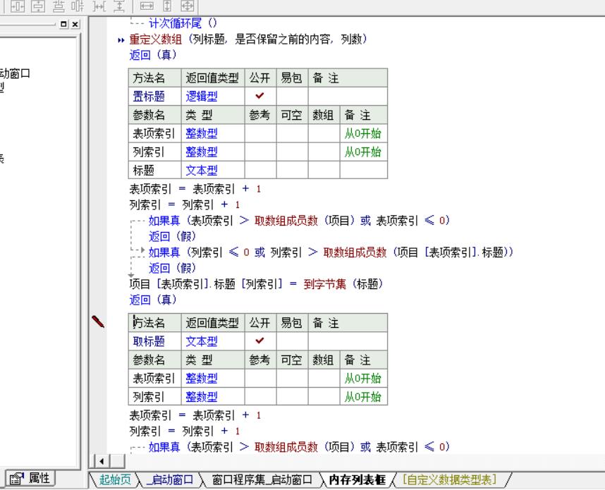 系统结构:全部删除,查看数据,导入列表框数据,重置列表框,置标题,取标题,保存到文件,从文件加载,置标题_字节集,取列表数据,置列表数据,取标题_字节集,取表项数,取列数,插入表项,取列标题,置列标题,删除表项,删除列,插入列,交换表项,取列索引,是否为空,生成数据,