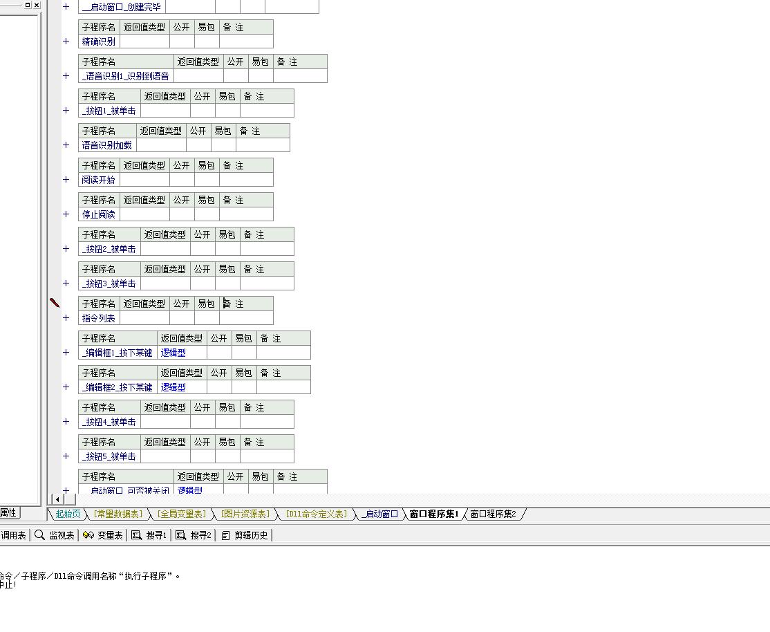 系统结构:精确识别,语音识别加载,阅读开始,停止阅读,指令列表,API_ShowWindow,API_取活动窗口句柄,API_取前台窗口,