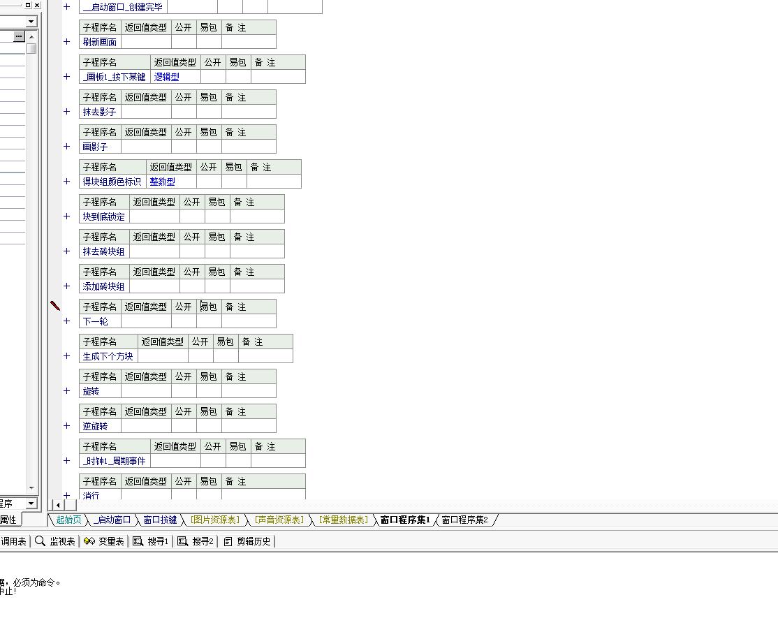 系统结构:刷新画面,抹去影子,画影子,得块组颜色标识,块到底锁定,抹去砖块组,添加砖块组,下一轮,生成下个方块,旋转,逆旋转,消行,重新开始,游戏结束,画预备块,画hold,画数据,