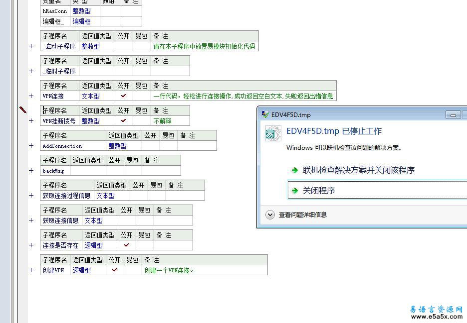 系统结构:VPN连接,VPN挂断拨号,AddConnection,backMsg,获取连接过程信息,获取连接信息,连接是否存在,创建VPN,创建连接,设置连接,lstrcpy,RasDial,RasHangUp,RasGetErrorString,复制内存数据,
